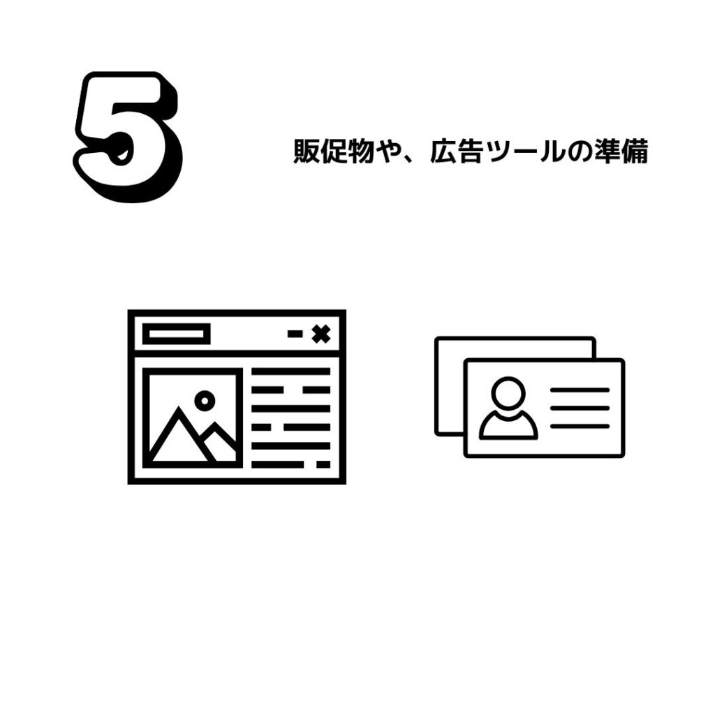 実際にお客様が来店してもらった際に必要な販促物を用意する必要があります。これから事業主という立場でたくさんの方と挨拶をしなければいけないので名刺は必須アイテムです。必要な新規集客をSNSでするのか集客サイトでするのかこのあたりも戦略が必要です。